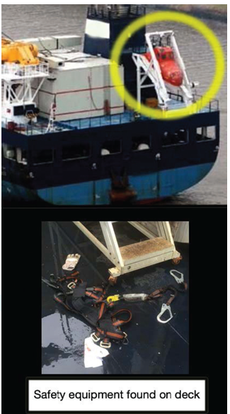 After further searches, the missing crewmember could not be found and was presumed to have fallen overboard. Search and Rescue units were activated, and search continued until darkness, without success. The lost lifeboat was retrieved and brought to shore for inspection. After close examination of the release gear and condition of the boat, it was reinstalled on board the vessel as it was undamaged.