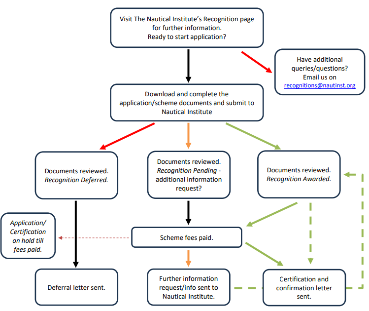 Recognition deferred – the product or service is insufficiently aligned with the aims of The Nautical Institute or from the evidence provided, the Institute is not satisfied that the processes employed in the provision of the product or service reflect good practice or meet the Institute’s approval criteria.Applications for recognition may, at any time, be referred to the Institute’s Professional Development Committee, which retains oversight of the recognition scheme. In all cases, the decision of the committee will be final.