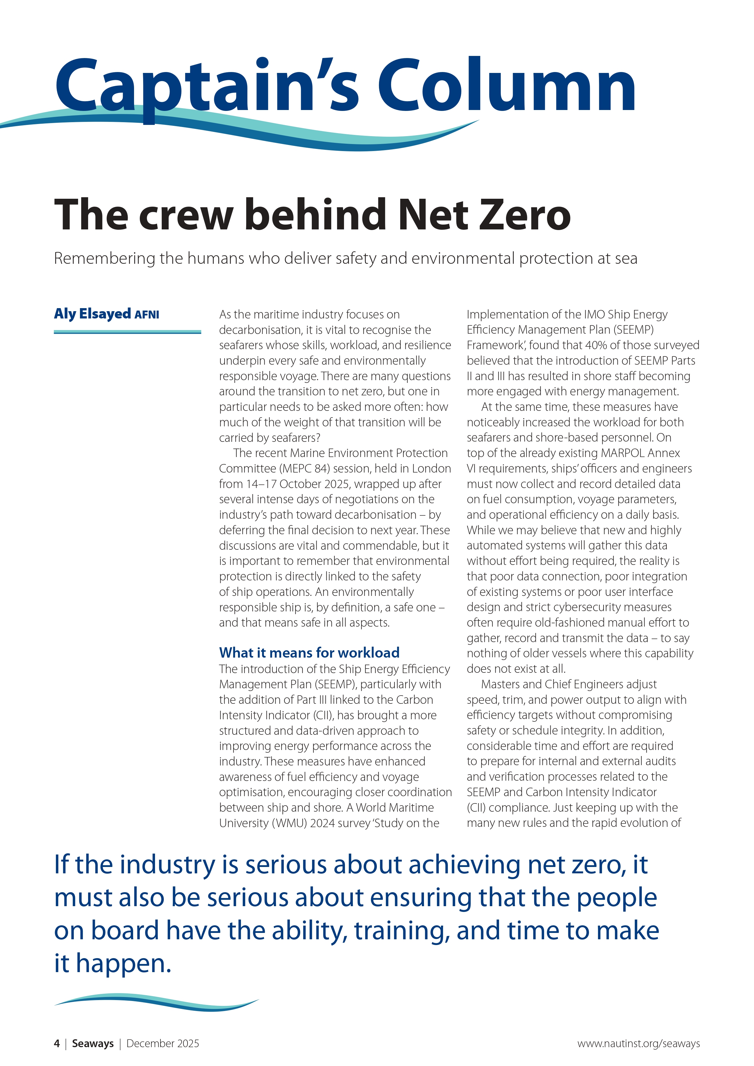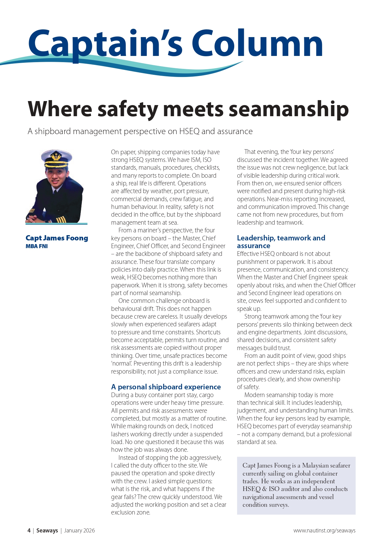Recognised as one of the leading maritime journals, Seaways is sent out to all members monthly. It is the international journal of The Nautical Institute and has the most vibrant professional correspondence section to be found anywhere in the industry.