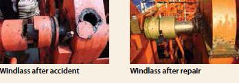 Several hours were required to effect temporary repairs to the windlass before the port anchor could be recovered. Permanent repairs required the replacement of the main shaft, studs and claw coupling among others.