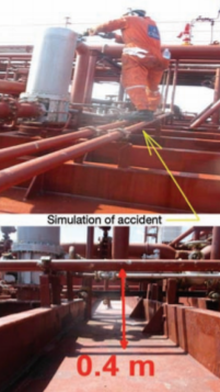 A tanker had loaded and left port while crew were still securing the deck for sea passage and making preparation for heating the cargo. One crew member was assigned maintenance duties on the deck heat exchangers. To perform these duties he was standing on hydraulic lines located some 40cm above deck and using a spanner to make the necessary adjustments.