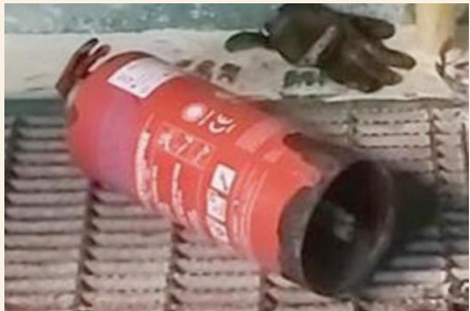 When the internal carbon dioxide cartridge was activated to pressurise the fire extinguisher, the unit ruptured at the base.