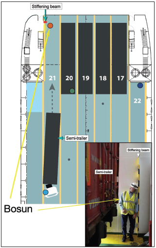 The tractor unit driver lost sight of the banksman as he was backing up, but, following a routine but unsafe workaround practice common at the port, continued the manoeuvre even after doing so. The driver assumed the bosun had moved to a safe position behind an adjacent trailer. However, the semi-trailer was at a slight angle, causing its rear to encroach upon the painted walkway where the bosun was standing. The bosun was trapped and crushed against a steel stiffening beam protruding from the vessel’s superstructure.