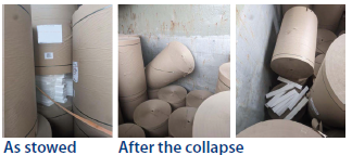 A general cargo vessel was in port and discharging rolls of paper. The rolls were chocked with polystyrene packing, and at one point during the discharge one of the rolls toppled. The roll was 1.4 metres in diameter, 2.2 metres high and weighed 2.6 tonnes. Fortunately, no one was injured in the incident.