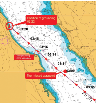 Sensing danger, the OOW immediately moved the engine control to neutral, and then full astern, but the vessel grounded nonetheless at 03:22. The Master was woken by the resulting noise and vibration, came to the bridge and sounded the alarm.