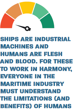 Excessive workloads can have a devastating effect on performance and safety. In the 1990s, the aviation industry adopted a programme called ‘Human Performance and Limitation’ (HPL). This was designed to help aeroplane pilots understand how the limitations of the human body can affect decision-making. This comprehension is just as crucial to mariners. Ships are industrial machines and humans are flesh and blood. For these to work in harmony, everyone in the maritime industry must understand the limitations (and benefits) of humans – and how to manage them properly.